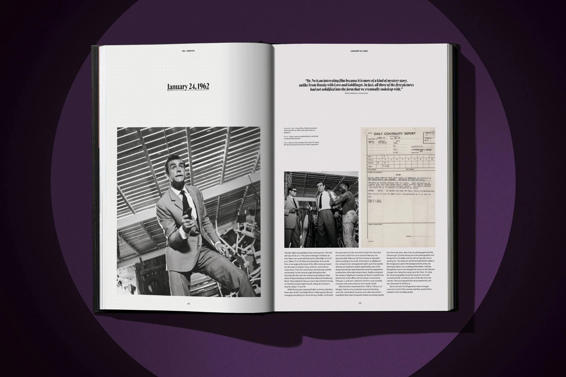 Auch die Geschichten hinter den Kulissen, erzählt von den Menschen, die dabei waren, zeichnen ein eigenes Bild. Von den Produzenten Albert R. „Cubby“ Broccoli und Harry Saltzman über den Regisseur Terence Young und den Produktionsdesigner Ken Adam bis hin zu den Darstellern, der Crew, den Autoren und den Stuntmen – ihre persönlichen Erinnerungen lassen den Leser zurück in die Zeit und an das Filmset von Dr. No reisen.